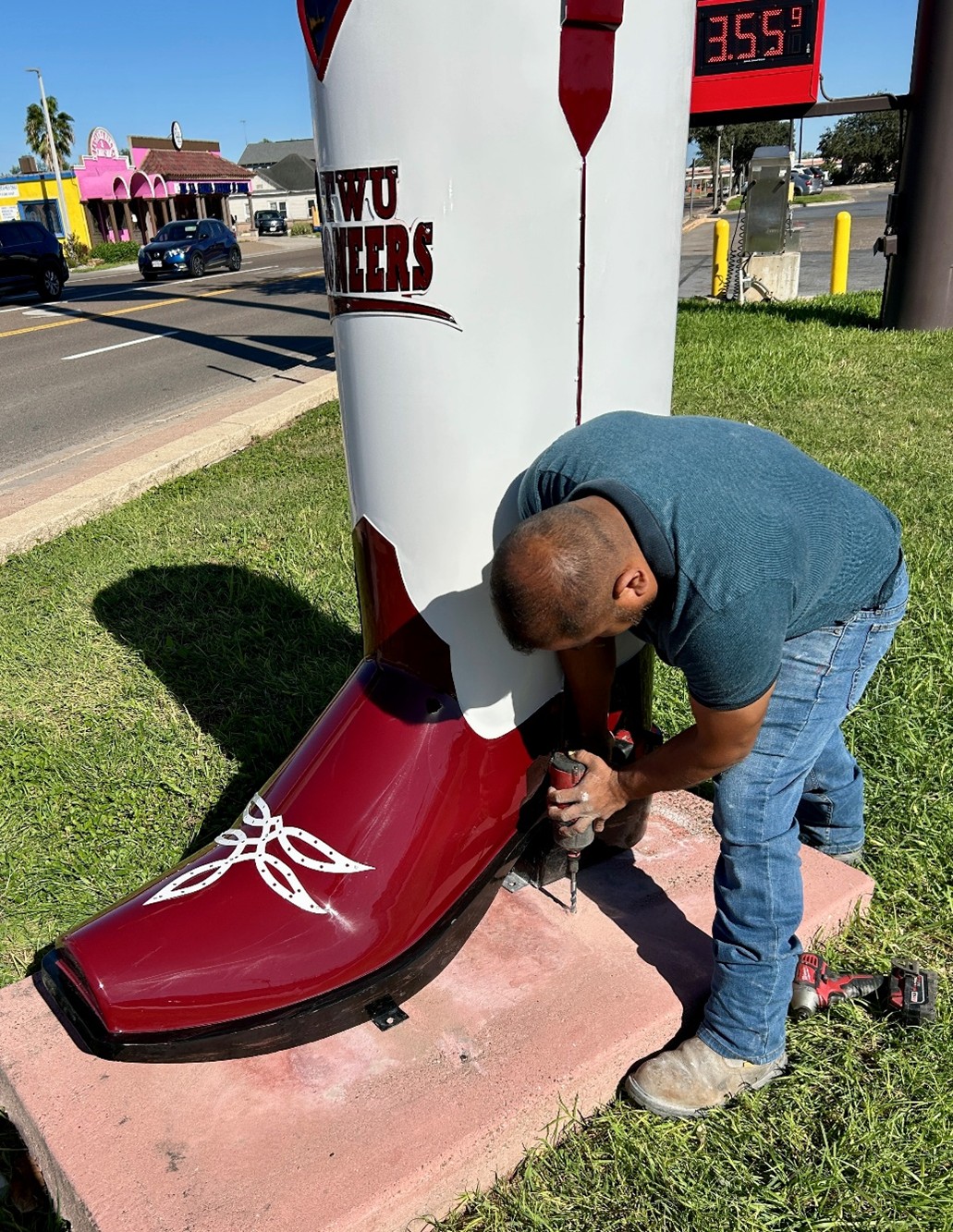 “It’s the city of boots, right?” he said while working on installing the maroon-and-white TWU boot on Texas Avenue near the H-E-B grocery store. “It gives me a lot of pleasure that I was given this opportunity to do this work for the city.”